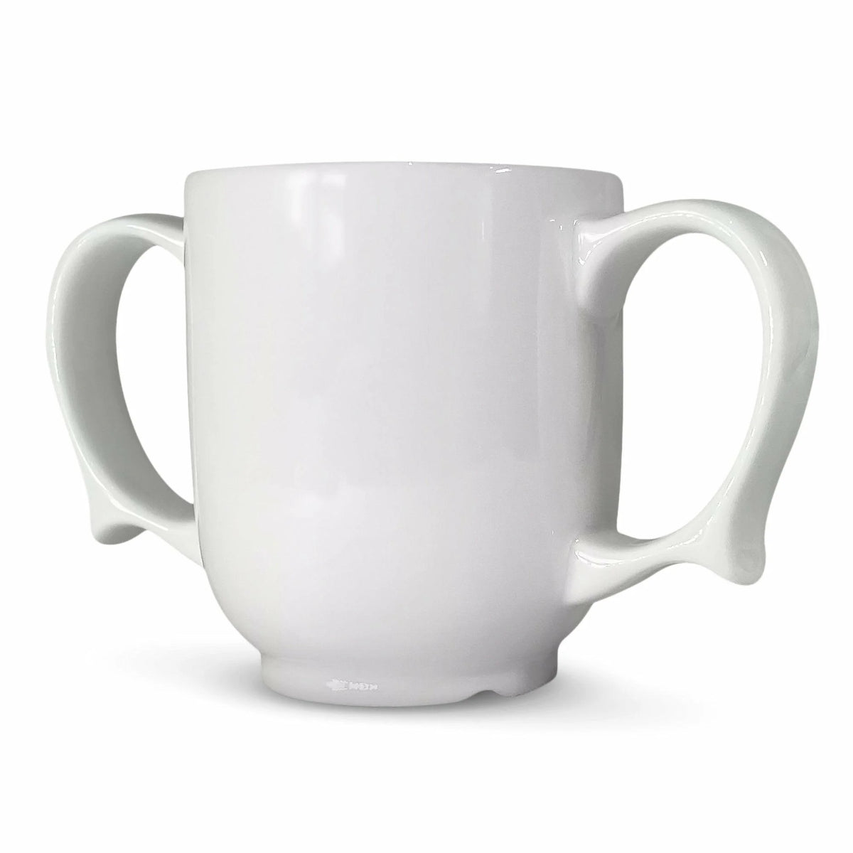 The two large handles on this mug enable a more secure and comfortable grip to faciliate independence when drinking as well as reducing the risk of accidents. The handles have a lip towards the bottom which gives additional control for those with limited mobility, strength in the hands, or those experiencing tremors or shakes. Microwave and dishwasher safe. Mug size: 15.2cm x 8.9cm ( 6" x 3½").