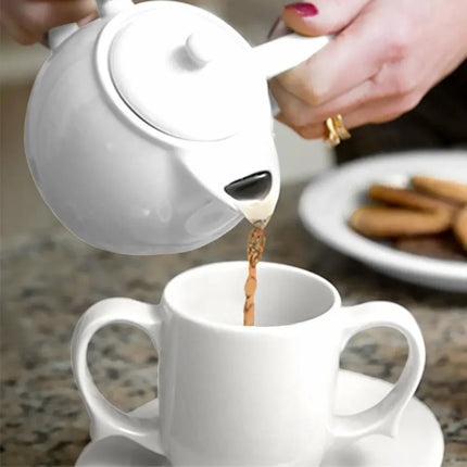 The two large comfortable handles on this Two Handled Teapot are generously sized and enable the teapot to be held and poured with two hands. The specially designed teapot has a simple locking mechanism to ensure the lid is secure during pouring. This helps to making pouring a cuppa safer and steadier, ideal for people with tremors or shakes. Stylishly designed, it comes in a choice of three elegant colours that enable it to stand out from its background. The teapot is made from vitrified Earthenware which has been given added strength from Alumina making it exceptionally robust and hardwearing. It is dishwasher safe and is an attractive addition to this quality range of ceramics. Teapot size: 12cm x 15.2cm (4¾" x 6"). Capacity – 2 cups.